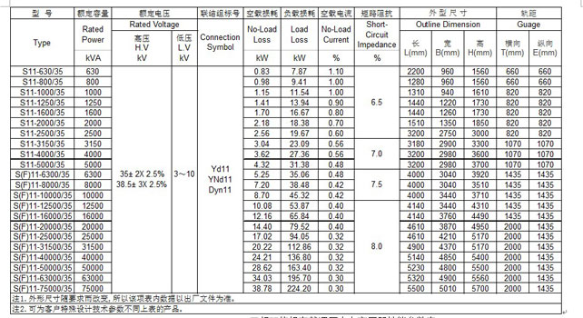 35kV 630~75000kVA三相雙繞組無勵(lì)磁調(diào)壓電力變壓器性能參數(shù)表 Technical Data Table of Three-phase Two-winding Off-circuit Tap Changing Power Transformers